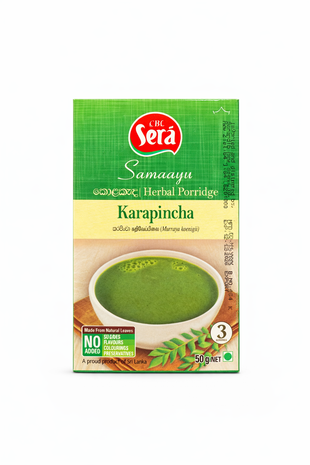 CBL Sera Samaayu Karapincha Herbal Porridge is a convenient and nutritious instant porridge mix that features Karapincha (curry leaves), a staple in Sri Lankan cuisine known for its aromatic flavor and health benefits. This porridge offers a wholesome meal option, combining traditional herbal ingredients with modern convenience.