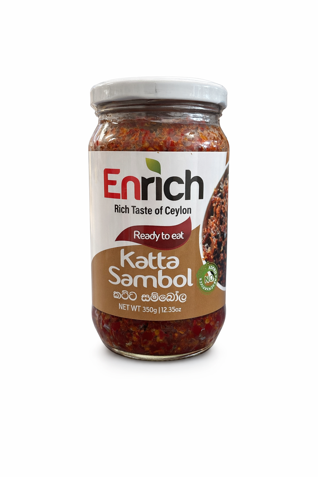 Enrich Katta Sambol 350g is a traditional Sri Lankan fiery chili relish crafted with dried red chilies, aromatic spices and savory seasonings. This ready‑to‑eat sambol delivers bold heat and intense flavor — perfect for spice lovers who want to add a powerful kick to their meals. Whether paired with rice, curries, hoppers, string hoppers, sandwiches or snacks, it brings authentic Sri Lankan heat and zest to every bite. Packaged in a 350g jar, it’s great for everyday use and sharing.
