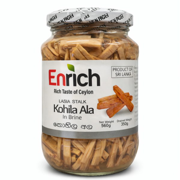Enrich Kohila Dalu in Brine 500 g is a premium Sri Lankan preserved vegetable product featuring tender kohila (Lasia spinosa) shoots packed in a carefully prepared brine solution. This traditional ingredient is popular in Sri Lankan kitchens for its authentic earthy flavor and versatility. The brine preserves the natural texture and freshness of the kohila dalu, making it convenient to use straight from the jar without any lengthy preparation. Ideal for adding depth to curries, stir-fries, mallung or as a side vegetable with rice and coconut sambol, it brings the taste of heritage Sri Lankan cuisine to everyday meals. The Enrich brand ensures high quality by following hygienic packing and preservation standards.